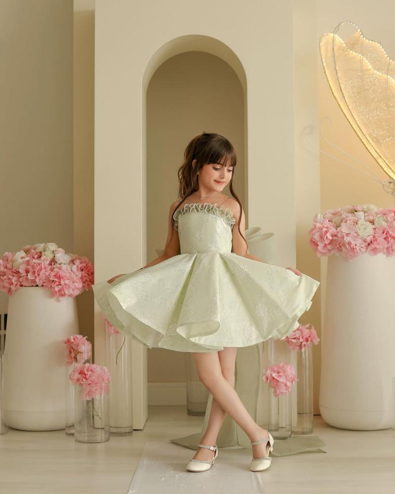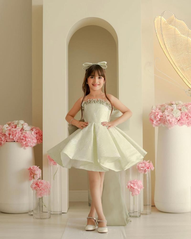 الفستان مصنوع من خامات ناعمة ومرنة، مما يوفر راحة استثنائية طوال اليوم. اللون الأخضر الفاتح يضفي لمسة من الحيوية والبهجة، بينما تضيف التفاصيل الدقيقة لمسة من السحر. تصميم الفستان مع حواف منسدلة وقصة مميزة يمنحان شكلًا جذابًا يتناسب مع كل الأجسام، مما يجعله خيارًا مثاليًا لكل الفتيات.